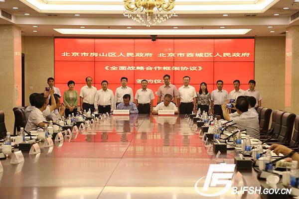 9月23日,房山区人民政府与西城区人民政府签署《全面战略合作框架协议》,房山区委书记曾赞荣,区委副书记、区长陈清;西城区委书记卢映川,区委副书记、区长王少峰出席签约仪式。