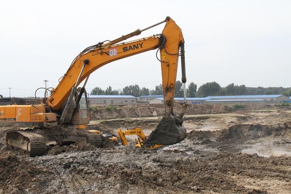 在大石河兴礼村至市界段中小河道治理施工现场,装载机、挖掘机、振动碾等大型机械设备正在紧张的施工中。区水务局综合计划与工程建设管理科副科长穆然与项目施工单位负责人正在查看铅丝石笼护砌的装填与绑扎情况。