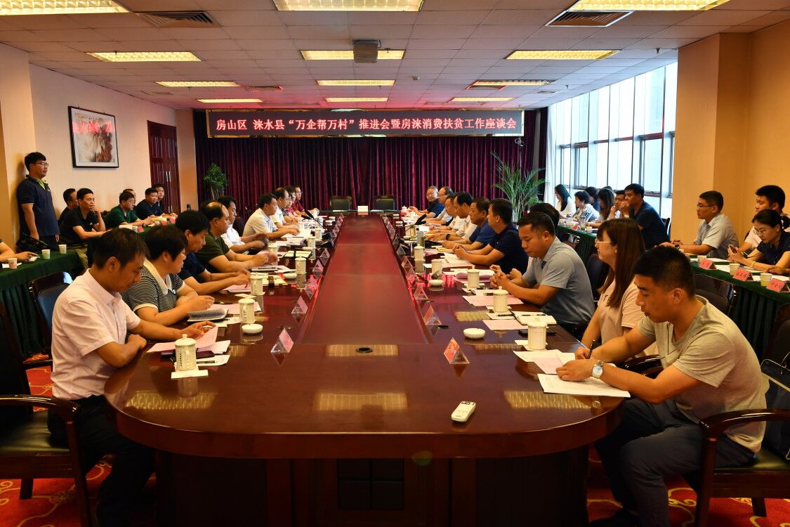 7月17日,根据房山区2019年扶贫工作安排,房山区政协组织扶贫企业家赴河北省涞水县召开房山区、涞水县“万企帮万村”推进会暨房涞消费扶贫工作座谈会。房山区政协常务副主席吕守军,涞水县县长朱明新出席会议。涞水县政协主席刘喜宗主持会议。